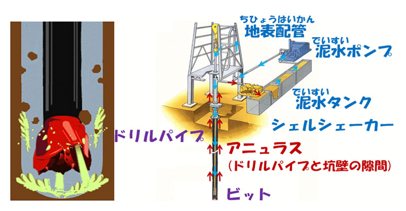 掘削はドリルパイプの先端にビットと呼ばれるドリルを取り付け、回転させて地中を掘り進めていきます。この時に掘りくずで埋まってしまわないようドリルパイプを通じて泥水(でいすい)と呼ばれる流体を循環させて掘りくずを排出します。