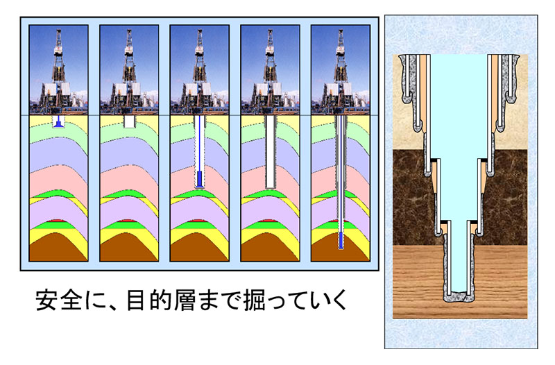 地下の圧力や崩れやすさは地層によって異なる場合があります。そのため、一気に掘るのではなく、掘った穴を保護するためにいくつかの区間に分けます。最初の区間まで掘ったらケーシングと呼ばれる保護管を設置して、そのケーシングと地層の間にセメントを押し込んで固定します。その後にケーシングよりサイズの小さいビットを使って更に掘り進めます。この作業を何回か繰り返しながら目標深度を目指します。