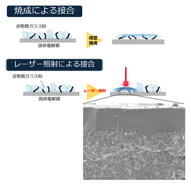 一方で、全固体ナトリウムイオン電池にはまだ克服すべき課題もあります。全固体電池には大きく分けて正極、固体電解質、負極の3つの固体から構成されています(図1)が、それらの固体同士の界面でイオンがスムーズに移動しにくいことや、製造時に高温での焼結が必要なためコストが高くなることなどです。これらの問題を解決するため、当研究グループでは、ガラスや結晶化ガラスを利用した新しい固体電解質の研究や、レーザーによる局所加熱を用いた界面形成技術を開発しています(図2)。ガラスのような物質は室温では固体ですが、加熱すると徐々に軟化し粘性の高い液体状態(過冷却状態)に変化します。粘性の高い状態ですから、加熱時間を制御することで、電池を構成する部材同士を接合することができます。加熱の方法は様々で、ヒーターでゆっくり加熱して作製する手法と、レーザー光を使ってミリ秒程度の短時間で1,700℃まで加熱して急冷する手法を考案しました。後者のレーザーを使った手法は3Dプリンティング技術に展開できます。作製した電池はいずれも発火することなく、幅広い温度域で安定して動作することを確認しています。