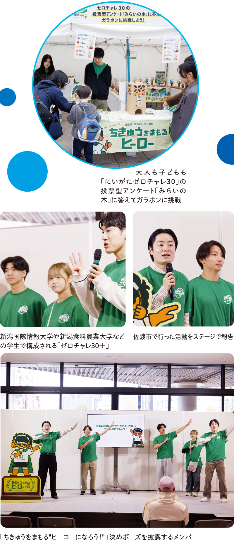 ゼロチャレ30士は最後に「ちきゅうをまもる“ヒーローになろう!”」とポーズを決めて脱炭素社会の実現に向けたアクションを呼びかけた。また、南口中央広場のブースでは、カーボンゼロの実現に向けた「にいがたゼロチャレ30」を周知した。